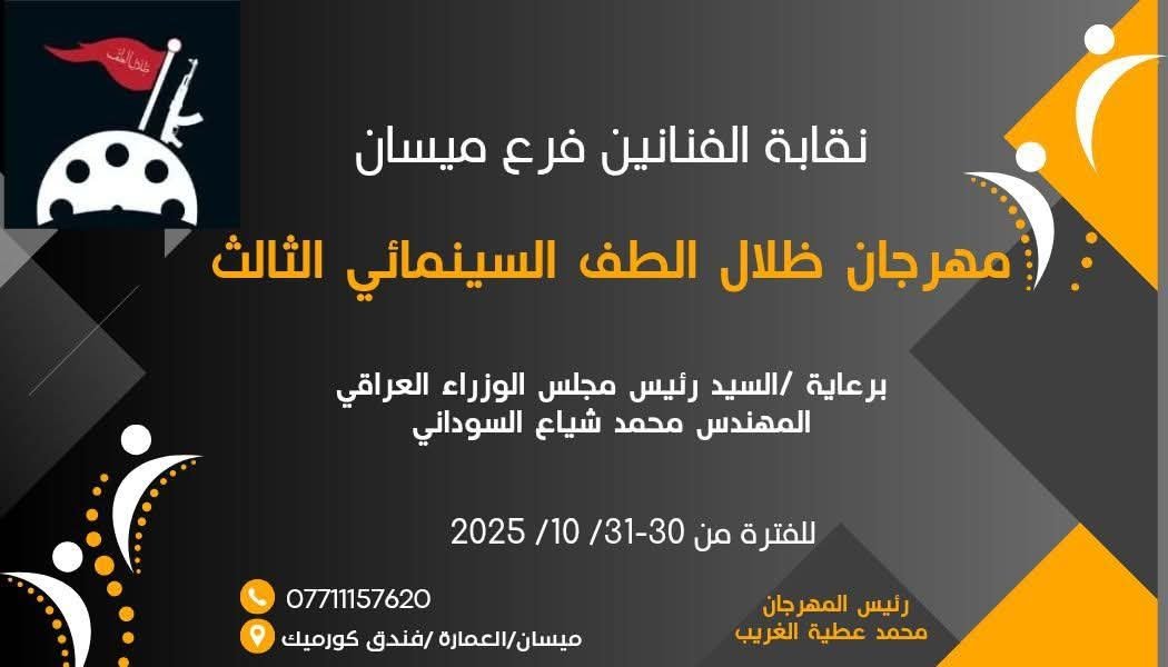 أعلنت نقابة الفنانين العراقيين فرع ميسان : عن موعد انطلاق مهرجان ظلال الطف السينمائي الدولي بنسخته الثالثة ( دورة الفنان الرائد مكي حداد سعيد ) , برعاية دولة رئيس الوزراء الاستاذ المهندس محمد شياع السوداني من يوم 10/30 إلى يوم 1/ 11 / 2025 بمشاركة عربية ودولية على قاعة فندق كورميك .